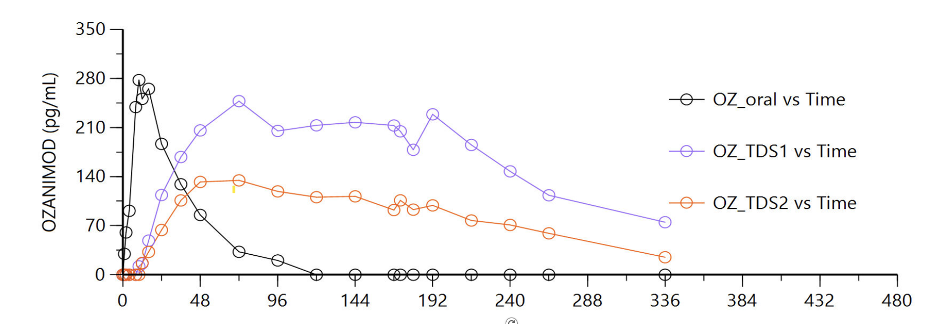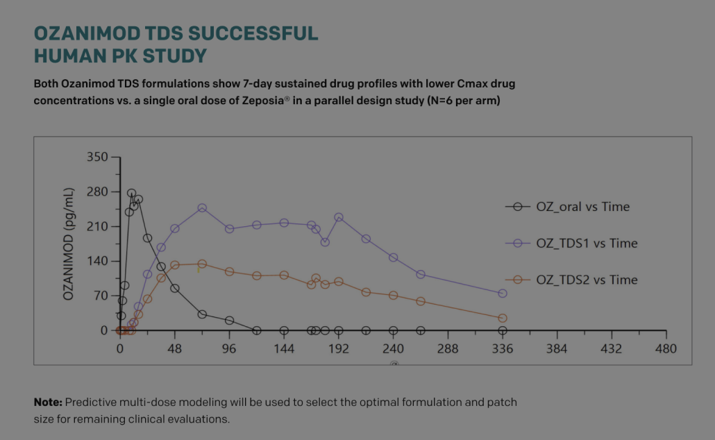 Corium has leveraged its Corplex® technology to develop the world's first 7-day transdermal system for an FDA/EU approved S1P receptor modulator (ozanimod), used to treat both Moderate-to-Severe Ulcerative Colitis and Relapsing Multiple Sclerosis. Recent human PK data clearly demonstrates 7-day sustained and continuous drug absorption for two varied formulations. Click the graph at the right to see the study results.